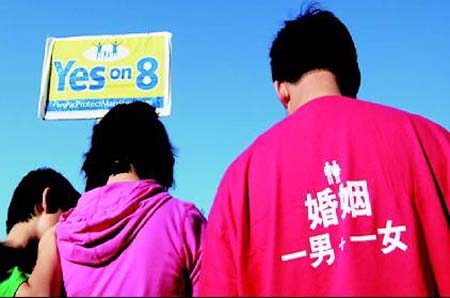 在11月4日舉行的美國大選投票中,一項反對同性婚姻的提案因為得到超過半數選民的支持而獲得通過。這一被稱為“8號提案”的加州立法提案在選舉之前引起廣泛關注:投票結果顯示有大約52.5%的加州選民支持這一提案,而選舉結果的公布也意味著在加州實行了幾個月的同性合法婚姻制度的夭折。