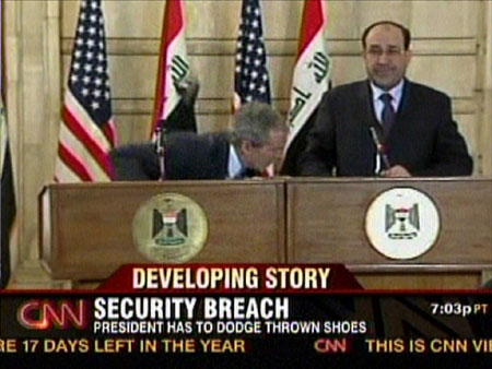 12月14日,還有37天即將卸任的美國總統布什突訪伊拉克。當天下午,在與伊拉克總理馬利基一同出席的新聞發布會上,兩位領導人剛握完手,扎伊迪突然跳起,將自己腳上的兩只鞋子脫下,連續向布什砸去。雖然布什低下頭靈敏地躲過了飛來皮鞋,但扎伊迪的兩只皮鞋還是重重地砸在了布什身后的美國國旗上。