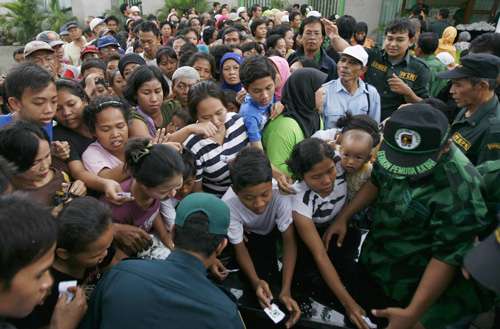 全球米價過去一年上漲超過一倍,在部分國家引發社會動蕩。圖為印尼雅加達的貧困居民爭先領取政黨派發的免費大米。