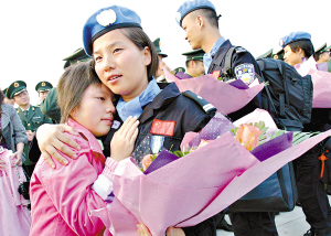 上午8時整,一架中國國際航空公司CF6-80C2專機穩穩地降落在白云機場停機坪,一面鮮紅的標有“中國維和警察防暴隊”旗幟首先從機艙門飄出,緊接著,95名胸前佩戴聯合國“和平勛章”的維和隊員依次走下懸梯,已經等候多時的家屬、戰友們立即沖了上去,當維和隊員王勝抱起4歲的兒子王子天時,實在忍不住紅了眼圈,因為上次抱起兒子時,這個小家伙才3歲。