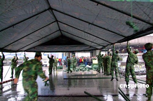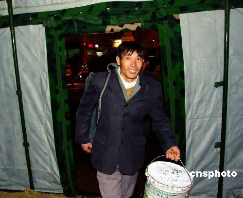 1月27日,南京軍區“硬骨頭六連”所在師接到杭州市政府請求支援電話,派出200余名工兵,火速趕往杭州火車站。官兵們寒著風雪嚴寒,很快搭設好12頂野戰帳篷,并在帳篷里鋪設了草墊子,為滯留旅客提供休息之地。滯留在車站的民工旅客走進野戰帳篷,臉上露出笑容,高興地說:今晚不會挨凍了,感謝黨和人民解放軍。據車站負責人介紹,因冰雪天氣影響,這天約有2萬名旅客滯留杭州火車站。中新社發 邱柏星 攝