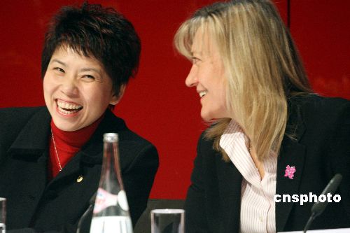 當地時間11日下午,北京奧組委奧運村部副部長鄧亞萍(左)和倫敦奧組委的官員、網球運動員出身的Debbie Jevans(右)在“婦女與奧運”論壇上交談。