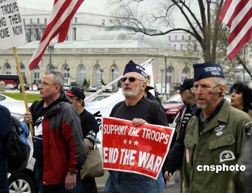 圖為示威者中曾經在伊拉克戰場執行任務的退伍老兵舉著抗議牌,上面寫著:“支持軍隊結束這場戰爭”。