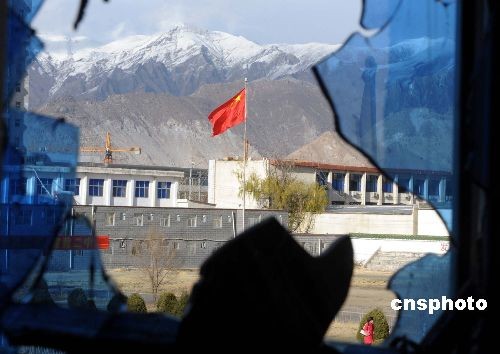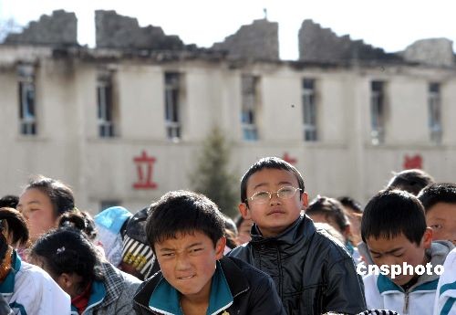 3月21日,拉薩二中的中學生在被焚毀的教室前集會控訴不法分子罪行。