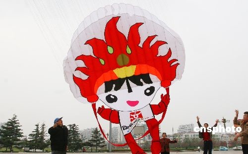圖:山東濰坊巨型奧運福娃風箏飛上天