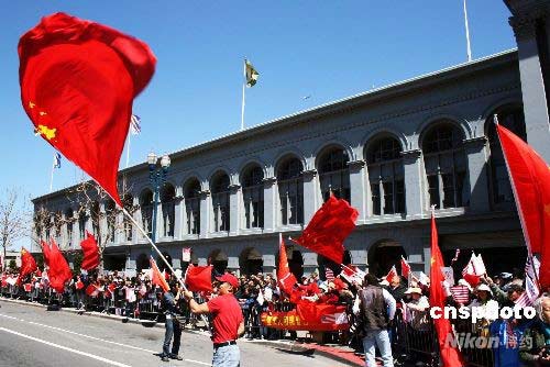組圖:海外同胞支持北京奧運(yùn) 護(hù)衛(wèi)圣火傳遞 (6)