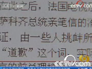 法國電視足足花了7分多鐘的時間報道與中國有關的4條消息。首先是法國參議院議長向金晶轉交薩科齊總統親筆信的消息。破天荒地在屏幕上打出薩卡奇信件的一句關鍵的話:“我在此向您保證,由一些人挑釁所引起的事件并不反映我的同胞們對中國人民的情感”。主持人說,雖然沒有明說“道歉”這個詞,實際上現在是法國人道歉尋求和解的時候了。