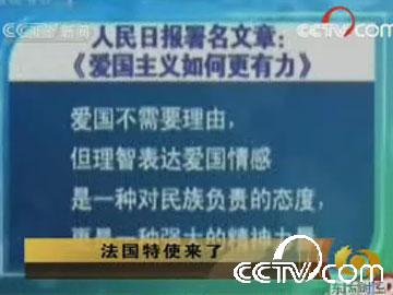 在北京,法國電視二臺記者現場調查抵制家樂福的呼吁到底有多大影響,詢問一位剛從家樂福出來的中國消費者對抵制家樂福的看法,這位男士一邊往車里裝采購袋一邊說:“應該抵制啊,要是法國是我們的朋友,為什么巴黎圣火會出這么多的事”。記者還找到了一位反對抵制的女士,這位年輕的女子說:“我反對抵制,這對中國的形象不好”、“賣的好多東西都是中國產品”。然后鏡頭一轉,法國新聞聯播居然切入了中國央視新聞聯播的鏡頭:人民日報發表文章《愛國主義如何更有力》。