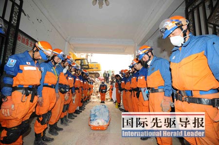 這是足以令每個(gè)中國(guó)人都為之震撼的一幕!5月17日早晨7點(diǎn)30分左右,四川青川縣喬莊鎮(zhèn)一處倒塌的六層樓廢墟旁,31名全副武裝的日本搜救隊(duì)員分成兩列,集體向兩名中國(guó)遇難者遺體默哀。經(jīng)過(guò)14個(gè)小時(shí)的努力,他們最終還是沒能挽回這兩條年輕的生命——一名27歲的女性宋雪梅和她剛出生75天的女兒。