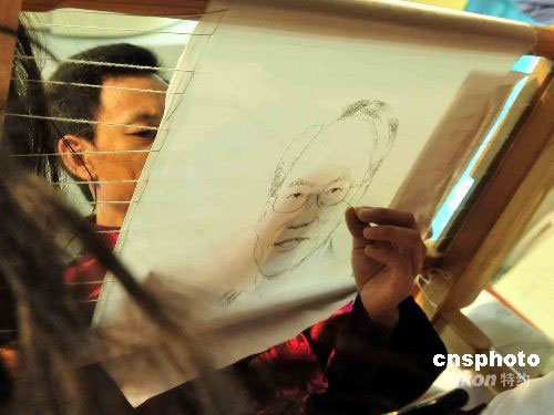 孟永國(guó)在記者會(huì)上特別創(chuàng)作了一幅特首曾蔭權(quán)的發(fā)繡畫。