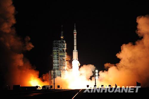 9月25日21時10分,長征二號F型運載火箭點火,神舟七號飛船在酒泉衛星發射中心升空。新華社記者李剛攝