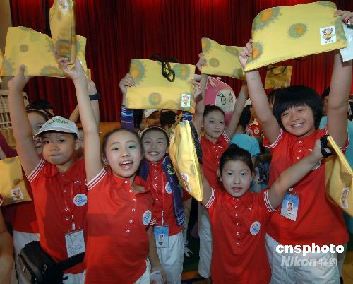 圖為來自福建的小營員們與臺北光復小學學生相互交換禮物。中新社發 劉可耕 攝