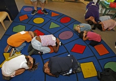 學生在大規模地震演習中。