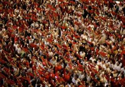 中新網(wǎng)7月15日電 綜合報(bào)道,7月15日凌晨,為期9天的盛大的奔牛節(jié)在西班牙北部城市潘普洛納落下帷幕。成千上萬(wàn)的狂歡者聚集到市政廳前,手舉蠟燭和紅絲巾參加閉幕活動(dòng)。