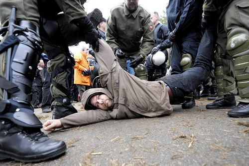 一位警方發言人稱,有1000多名反核示威者坐在位于小鎮戈萊本附近的存儲設施大門外,部署在那一地區的數千名防暴警察已將示威者逐個拖走。這些示威者是15000多名示威者中的一部分,示威者在上周末舉行了大規模的示威活動以阻止核廢料抵達存儲設施。警方為了保證核廢料運輸活動的安全部署了16000名警員。
