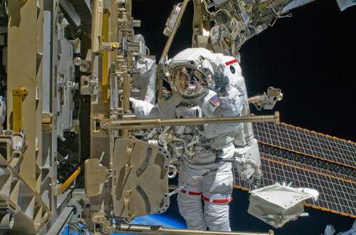 美國太空人甘保二十日執行任務時,停下來向鏡頭揮手。(美國宇航局圖)