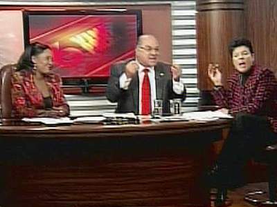 女參選人一臉不屑,故意把水杯碰翻打濕了男議員的膝部,而男士也顧不得風度,馬上拿另一杯水迎面還擊,女士臉色氣得發(fā)白。在一旁的主持人震驚地上氣不接下氣。