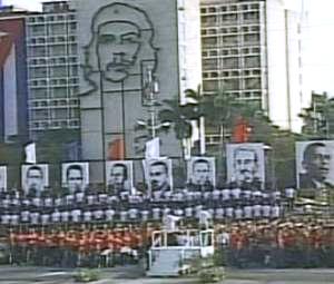 革命廣場上樹立起馬克思、恩格斯和列寧的肖像,還有當年古巴游擊隊領導人切·格瓦拉的大幅圖像。勞爾·卡斯特羅于今年2月當選古巴國務委員會主席,正式接替身體日益虛弱的菲德爾·卡斯特羅的職務,但黨的第一書記仍由菲德爾·卡斯特羅擔任。
