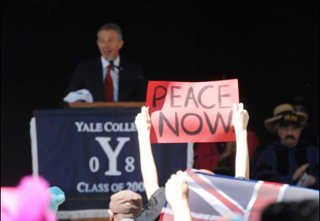 布萊爾在抵達(dá)耶魯大學(xué)遇到了一小群示威者,他們揮動著寫有“對布萊爾說不”、“耶魯!不要支持一名戰(zhàn)犯”的標(biāo)語牌,警方?jīng)]有讓這些示威者進(jìn)入講演會場。講演是在一個有門的大花園內(nèi)進(jìn)行的。但當(dāng)54歲的布萊爾走上主席臺時,一些學(xué)生展示了紅色的標(biāo)語,上面寫著“現(xiàn)在就實(shí)現(xiàn)和平”、“不要戰(zhàn)爭”。學(xué)生是將這些標(biāo)語放在畢業(yè)袍里帶進(jìn)會場的。一名戴著頭巾的女學(xué)生在布萊爾講演時一直站著,她在距布萊爾約3米遠(yuǎn)的地方舉著“現(xiàn)在就要和平”的標(biāo)語。布萊爾看起來非常努力地不去看那名女學(xué)生。布萊爾在講演時也未直接提到伊拉克,他在講演時談到了氣候變化的問題、由宗教加劇的恐怖主義。布萊爾將于明年在耶魯大學(xué)開信仰和全球化課程。