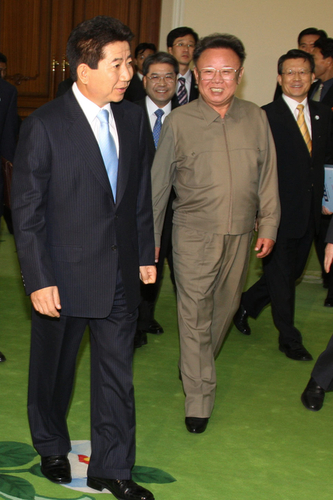 資料圖:2007年10月3日,韓國總統盧武鉉與朝鮮國防委員長金正日舉行首次首腦會談時,就金正日前一天親自出來迎接表達謝意,而金正日對此以“我又不是患者”來回應,再次表現出其幽默的一面。