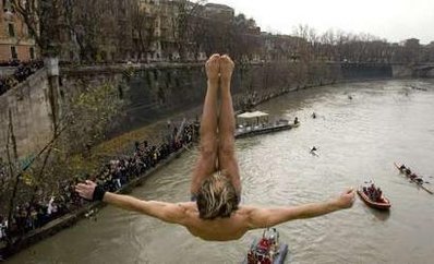 據(jù)臺灣“東森新聞”報道,當(dāng)你看到綽號“泰山”的男子,又出現(xiàn)在意大利臺伯河上方時,你就知道新的一年又來了!他將從大橋上一躍而下,高度總共有17米,救難人員已經(jīng)在一旁待命;當(dāng)他優(yōu)雅地跳到臺伯河中,救難人員立刻開救生艇過去拉他一把。
