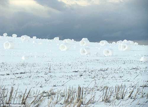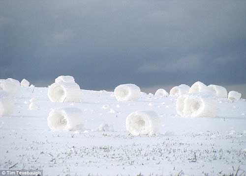 長(zhǎng)的極像白色干草卷的雪卷最高能達(dá)2英尺,這些被風(fēng)吹卷起的雪堆,通常是圓柱形,兩頭是凹面。