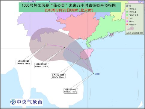 10時,“蒲公英”中心位于海南省三亞市南偏東方大約290公里的南海中部海面上,就是北緯15.9度、東經110.8度,中心附近最大風力有8級(20米/秒),中心最低氣壓為988百帕。