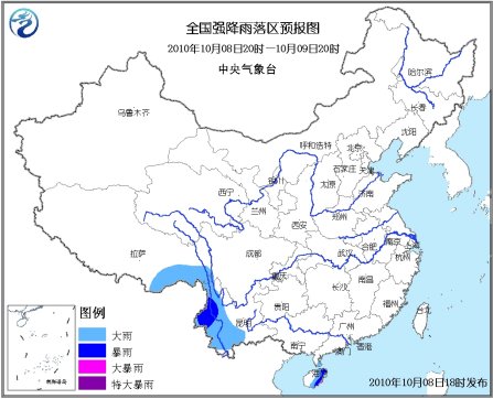 10月8日20時到9日20時,海南中東部、雷州半島東南部、云南西部、西藏東南部等地有大雨或暴雨,其中海南東南部的局部地區有大暴雨;上述地區局部伴有短時雷雨大風等強對流天氣。