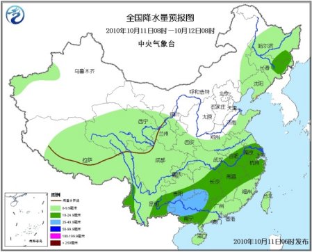 中新網10月11日電 據中央氣象臺預報,未來三天,新疆西部、西藏中東部、青海大部、內蒙古東部、東北大部、川西高原北部等地有小到中雨(雪)或雨夾雪,西北地區東南部、黃淮南部、江淮、江漢、江南、華南、西南等地有小到中雨或陣雨,其中,貴州大部、廣西中北部、湖南北部、湖北南部、重慶東南部、浙江中北部等地有中到大雨,上述地區局部并伴有短時雷雨大風等強對流天氣。