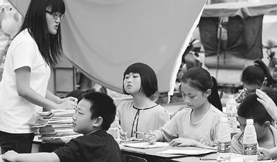 4月25日,蘆山縣地震災區的孩子們在志愿者建立的臨時帳篷學校里補習功課。