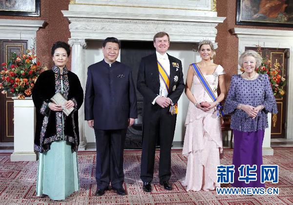 3月22日,國(guó)家主席習(xí)近平在阿姆斯特丹會(huì)見荷蘭國(guó)王威廉-亞歷山大。當(dāng)晚,威廉-亞歷山大國(guó)王在王宮為習(xí)近平舉行盛大國(guó)宴。威廉-亞歷山大國(guó)王、馬克西瑪王后、貝婭特麗克絲前女王共同迎接習(xí)近平和夫人彭麗媛到來。新華社記者鞠鵬攝