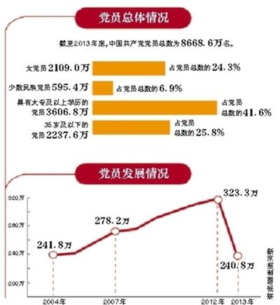 根據(jù)中組部公開的數(shù)據(jù),截至2013年底,中國共產(chǎn)黨黨員總數(shù)為8668.6萬名,比上年凈增155.9萬名,增幅為1.8%。在2012年,黨員總數(shù)的增幅為3.1%。2013年全國共發(fā)展黨員240.8萬名,較上年減少82.5萬名,降幅為25.5%。