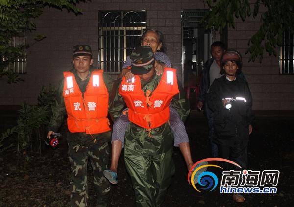 同時(shí),三江鎮(zhèn)地勢較低的梅坡村在暴雨中完全被淹,100余名村民被困,災(zāi)情刻不容緩。武警海口市支隊(duì)派出100余名官兵涉水步入村莊迅速轉(zhuǎn)移群眾。官兵們把繩索系在身上,不斷地在黑夜里呼喊:“有沒有人,我們來救你們了!”官兵們挨家挨戶進(jìn)行搜索,進(jìn)入被淹民房將災(zāi)民背出轉(zhuǎn)移至安全地帶。截止記者發(fā)稿時(shí),120余名群眾已全部被安全轉(zhuǎn)移。