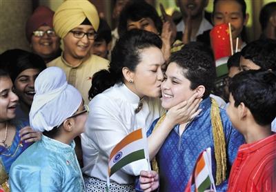 9月18日,印度新德里,彭麗媛訪問泰戈爾學(xué)校,與兒童親密互動。