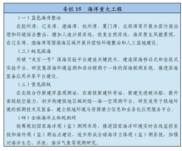 優(yōu)化海洋產(chǎn)業(yè)結(jié)構(gòu),發(fā)展遠(yuǎn)洋漁業(yè),推動(dòng)海水淡化規(guī);瘧(yīng)用,扶持海洋生物醫(yī)藥、海洋裝備制造等產(chǎn)業(yè)發(fā)展,加快發(fā)展海洋服務(wù)業(yè)。發(fā)展海洋科學(xué)技術(shù),重點(diǎn)在深水、綠色、安全的海洋高技術(shù)領(lǐng)域取得突破。推進(jìn)智慧海洋工程建設(shè)。創(chuàng)新海域海島資源市場化配置方式。深入推進(jìn)山東、浙江、廣東、福建、天津等全國海洋經(jīng)濟(jì)發(fā)展試點(diǎn)區(qū)建設(shè),支持海南利用南海資源優(yōu)勢發(fā)展特色海洋經(jīng)濟(jì),建設(shè)青島藍(lán)谷等海洋經(jīng)濟(jì)發(fā)展示范區(qū)。