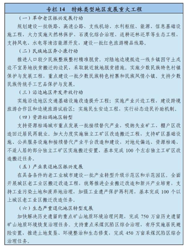 加強(qiáng)政策支持,促進(jìn)資源枯竭、產(chǎn)業(yè)衰退、生態(tài)嚴(yán)重退化等困難地區(qū)發(fā)展接續(xù)替代產(chǎn)業(yè),促進(jìn)資源型地區(qū)轉(zhuǎn)型創(chuàng)新,形成多點(diǎn)支撐、多業(yè)并舉、多元發(fā)展新格局。全面推進(jìn)老工業(yè)區(qū)、獨(dú)立工礦區(qū)、采煤沉陷區(qū)改造轉(zhuǎn)型。支持產(chǎn)業(yè)衰退的老工業(yè)城市加快轉(zhuǎn)型,健全過剩產(chǎn)能行業(yè)集中地區(qū)過剩產(chǎn)能退出機(jī)制。加大生態(tài)嚴(yán)重退化地區(qū)修復(fù)治理力度,有序推進(jìn)生態(tài)移民。加快國有林場和林區(qū)改革,基本完成重點(diǎn)國有林區(qū)深山遠(yuǎn)山林業(yè)職工搬遷和國有林場撤并整合任務(wù)。