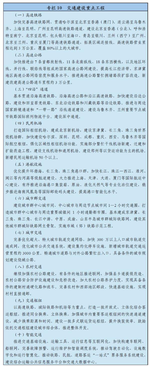 構建橫貫東西、縱貫南北、內暢外通的綜合運輸大通道,加強進出疆、出入藏通道建設,構建西北、西南、東北對外交通走廊和海上絲綢之路走廊。打造高品質的快速網絡,加快推進高速鐵路成網,完善國家高速公路網絡,適度建設地方高速公路,增強樞紐機場和干支線機場功能。完善廣覆蓋的基礎網絡,加快中西部鐵路建設,推進普通國省道提質改造和瓶頸路段建設,提升沿海和內河水運設施專業化水平,加強農村公路、通用機場建設,推進油氣管道區域互聯。提升郵政網絡服務水平,加強快遞基礎設施建設。
