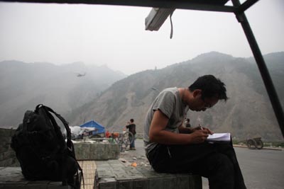 中新社記者宋方燦在重災區映秀寫稿