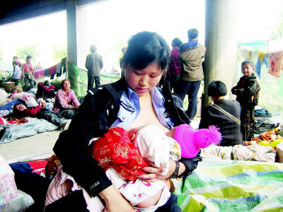 地震發生后,被轉移來的嬰兒除了可以喝一點水和稀飯外,沒有其他東西可吃。“大人還可以餓、還可以忍,而這些小嬰兒卻不能餓、不能忍!作為母親,我覺得這些孩子太可憐了。正好我還在哺乳期,就讓我來給他們喂奶吧!”在受災群眾安置點協助工作的29歲民警蔣曉娟提出:我去給這些嬰兒哺乳!
