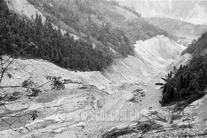 從百花大橋出口處山路行進幾公里,到了牛圈溝。進入溝內不久,專家們被兩邊的情景驚呆了,這里更像是冰川遺跡:一大堆土石組成的固體流從兩公里外的一條支溝傾泄而來,將所過之處掃得精光,兩道棱角分明的沖刷印跡,如刀削般留在溝兩邊的山體上;山體印跡以上樹林茂密,少有損傷;印跡之下,只有堆堆土石。固體流在傾泄過程中,曾受到山體阻攔,產生了三次折向,折向處有明顯的上揚跡象,最高處達60米。