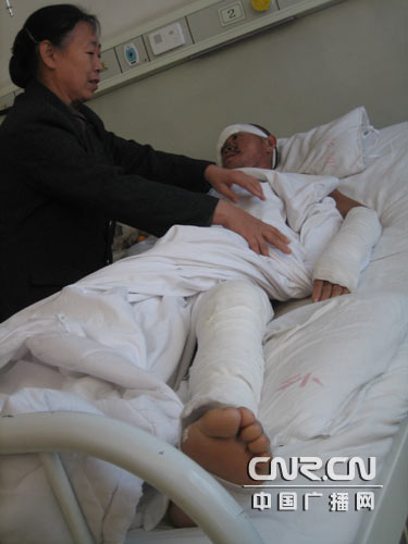 通過兩個(gè)村村民的描述,我們對(duì)事發(fā)當(dāng)天的情況有了大致的了解。當(dāng)天上午8點(diǎn)多,行兇者首先出現(xiàn)在艾各莊村,毆打了現(xiàn)場(chǎng)的幾十位村民,隨后這伙人又來(lái)到霍其營(yíng),同樣的暴行再次上演。兩個(gè)村子共有19位村民被送往醫(yī)院接受治療。在廊坊市人民醫(yī)院記者見到了一部分受傷的村民。受傷最重的是霍其營(yíng)的村民李連才,當(dāng)時(shí)他正路過鐵路橋下,去接自己的岳母回家,不明所以便被忽然圍上來(lái)的人打了一頓。他只清晰地記得那些人穿鐵路十七局的工服。“我都不知道怎么回事兒。結(jié)果就跑,那就不知道了以后。”醫(yī)生介紹說(shuō),李連才的顱骨骨折,滿口的牙都被打掉了,身上也多處骨折。醫(yī)生為記者介紹了他的傷情:“把這個(gè)皮膚連頭皮全部裂開以后,里邊能看見骨折線。顱底骨折呢,他來(lái)的時(shí)候有鼻出血,耳有鼻漏。還有他鼻骨折了,我們照片子他確實(shí)是折了,而且他來(lái)的時(shí)候滿口的牙都掉下來(lái)了,幾乎就沒有多少牙在上面了。出院以后三個(gè)月以后要鑲牙的。面部這個(gè)皮裂傷也挺重的,也縫了也是挺嚴(yán)重的。跟腱部跟他后邊的皮膚裂傷,就因?yàn)樗蟛科つw裂傷,造成跟腱整個(gè)兒就撕下來(lái)了。”