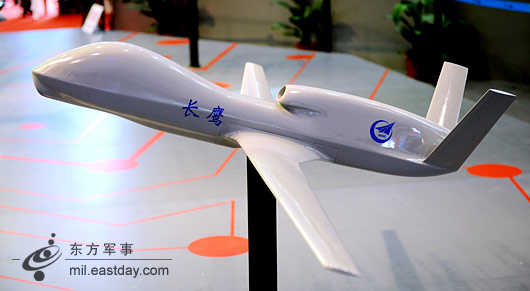 在“暗劍”旁邊的是“長鷹”無人機,有著和美軍“全球鷹”無人機類似響亮的名字,外形同樣類似“全球鷹”。“長鷹”做為專用無人戰(zhàn)略偵察機,具有大范圍的持久監(jiān)視、偵察和情報收集功能,為C4KISR任務系統(tǒng)重要組成部分,看來連作用都與“全球鷹”全面接軌了。