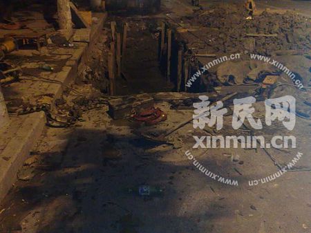 圍觀的居民告訴新民網記者,可能是由于事發地旁開挖的污水處理池在挖掘的過程中將管道挖破造成的。受爆炸的影響,萬航渡路康定路口地面已翹起約7、8厘米。