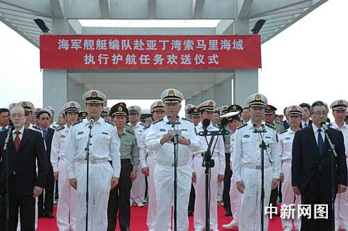 中新網(wǎng)12月26日電 由“?凇碧(hào)、“武漢”號(hào)和“微山湖”號(hào)綜合補(bǔ)給艦組成的中國(guó)海軍艦艇編隊(duì)今天下午13時(shí)45分宣布從三亞啟航,赴亞丁灣、索馬里海域執(zhí)行護(hù)航任務(wù)。中央軍委委員、海軍司令員吳勝利在歡送儀式上說(shuō),海軍艦艇編隊(duì)執(zhí)行此次護(hù)航任務(wù),是中國(guó)首次使用軍事力量赴海外維護(hù)國(guó)家戰(zhàn)略利益。