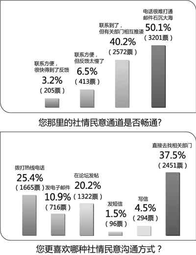 在通訊方式日新月異的今天,網友更喜歡哪種社情民意溝通方式?調查顯示,如果有問題向政府咨詢或者投訴,直接去找相關部門仍是網友的首選,37.5%的人選擇了這種方式。而選擇撥打熱線電話的網友超過25%,選擇發電子郵件、在論壇發帖、發短信等新興通訊方式的超過30%,只有4.5%的網友選擇傳統的書信聯系方式。(記者紀雅林)
