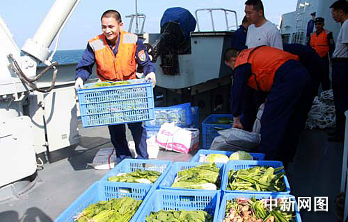 “海口”艦官兵搬運補給到艦上的新鮮蔬菜。 中新網記者 孫自法 攝