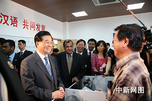 參觀過(guò)程中,胡錦濤向三位不遠(yuǎn)萬(wàn)里來(lái)到這里執(zhí)教的中國(guó)老師張?chǎng)巍⑽簮?ài)玲、郭衛(wèi)紅表示感謝。