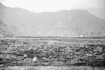 3月19日,拉薩西北郊的拉魯濕地內,枯草正在醞釀綠意,一群群鳥兒上下翻飛。