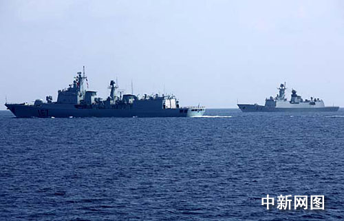 中新網4月13日電 據中央電視臺報道,中國海軍兩批護航艦艇編隊今日正式會合,并舉行了簡短莊重的會合儀式。
