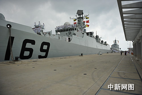 當天上午九時許,創造中國海軍多項歷史、功勛卓著的“武漢”號、“海口”號導彈驅逐艦緩緩駛入 三亞某軍港碼頭,受到岸上社會各界的熱烈歡迎。